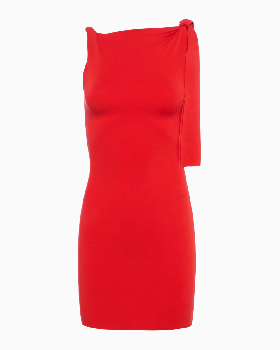 A fitted mini dress with tie detail on one shoulder. Made from sueded stretch – a buttery-soft, flexible fabric with a brushed, suede-like texture.
