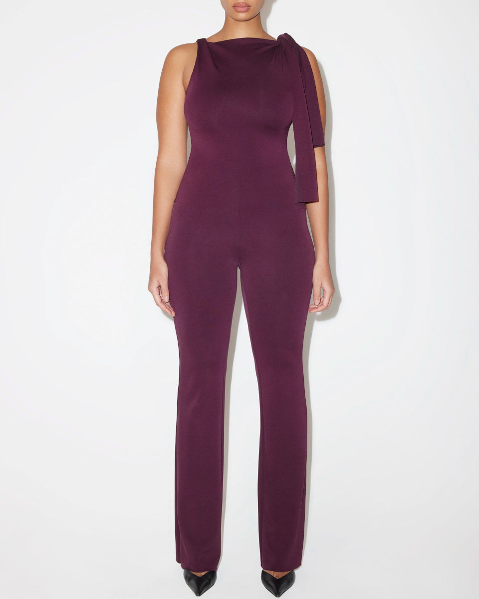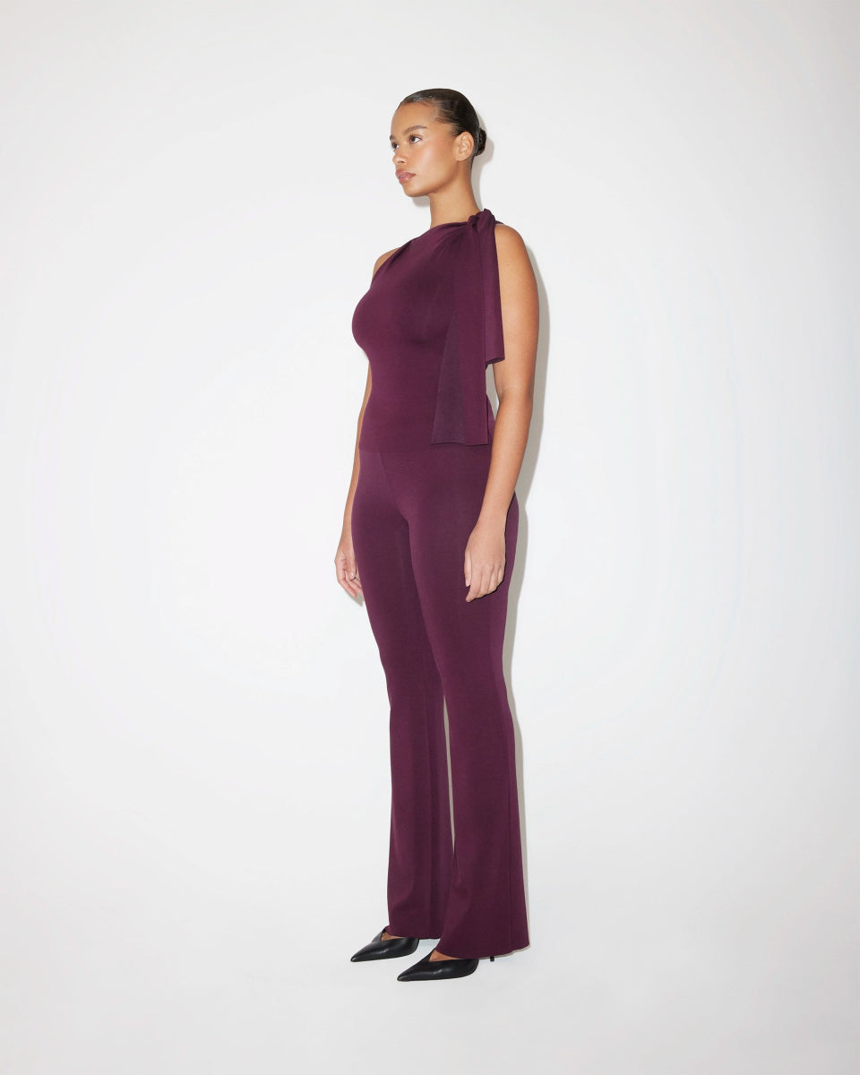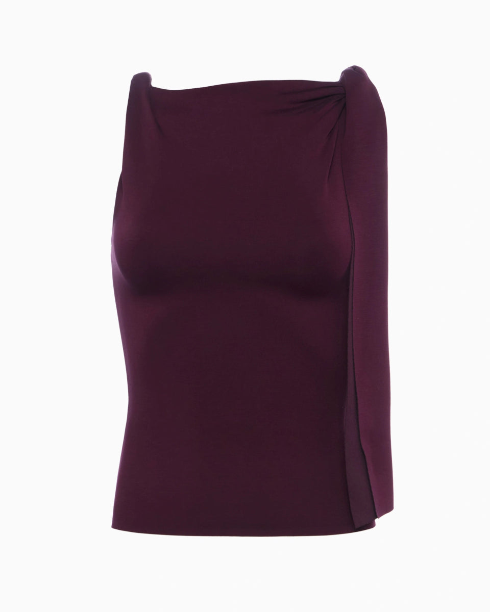 A fitted top with tie detail on one shoulder. Made from sueded stretch a buttery-soft, flexible fabric with a brushed, suede-like texture.