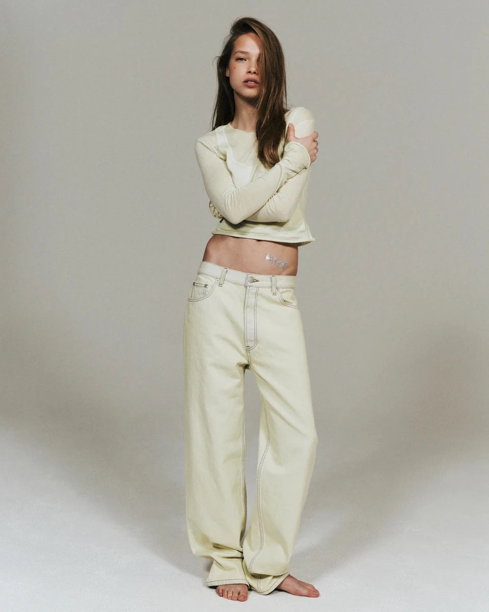 A jean in Cone Mills American cotton denim with a soft parchment wash.
