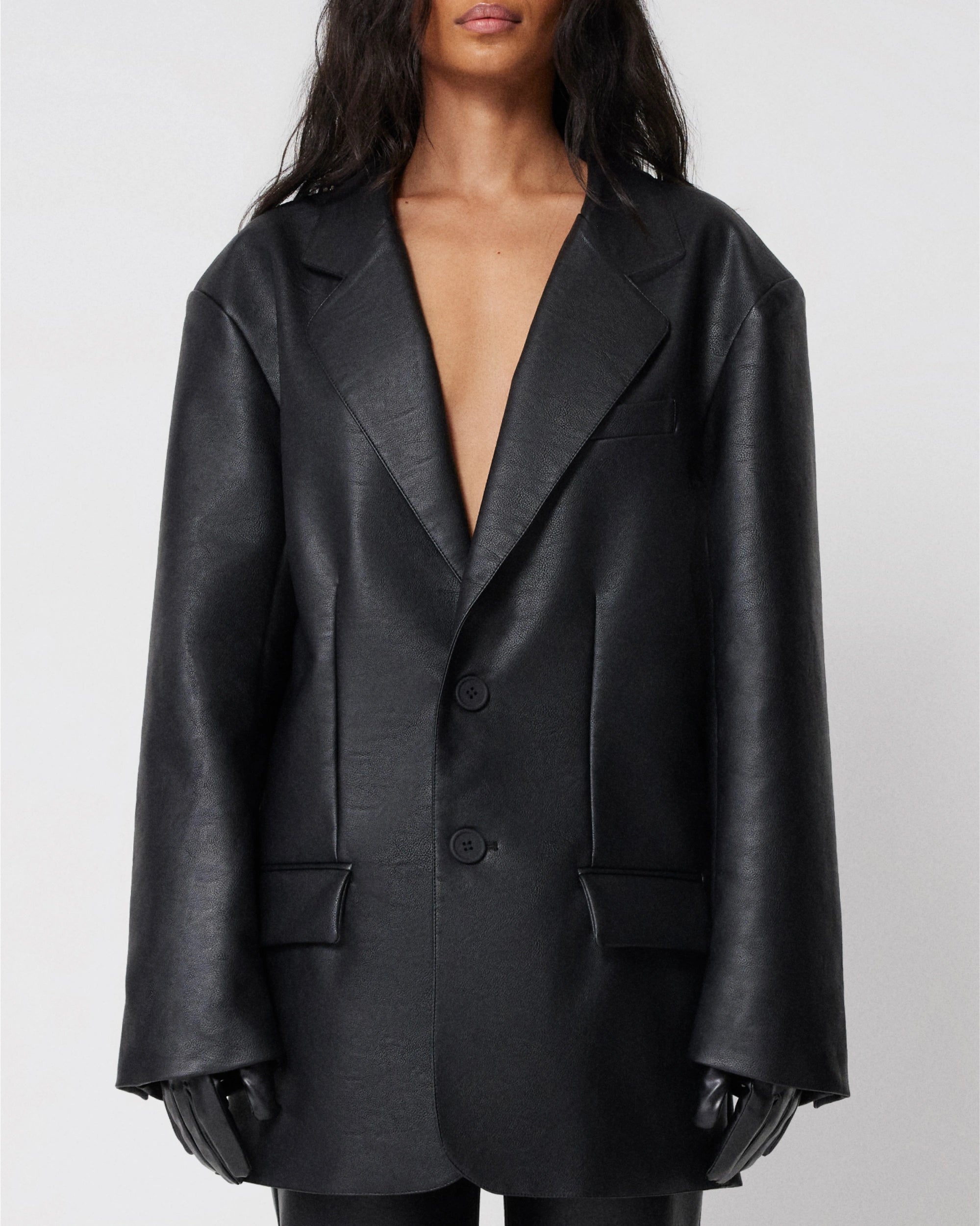 This is a boxy, ultra-oversized blazer with a drop shoulder and flap pockets. Made from a textured, structured, premium faux leather.
