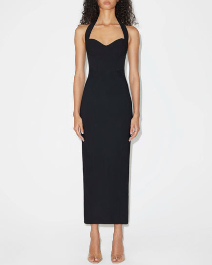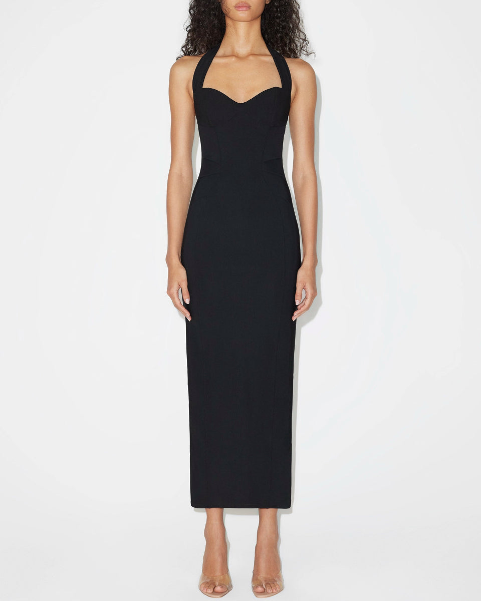 A total bombshell. This Fitted Halter Dress features a sweetheart neckline, pleating at the waist and carefully constructed seams at the bust and rear to accentuate lift and make a foundation for your curves. Bust is constructed with under-bust seaming details to accentuate your curves. Hem is finished with a satin ribbon detail at the back and hook-and-eye detailing with an ankle-length hem. Invisible zip closure at back sash at the center back.