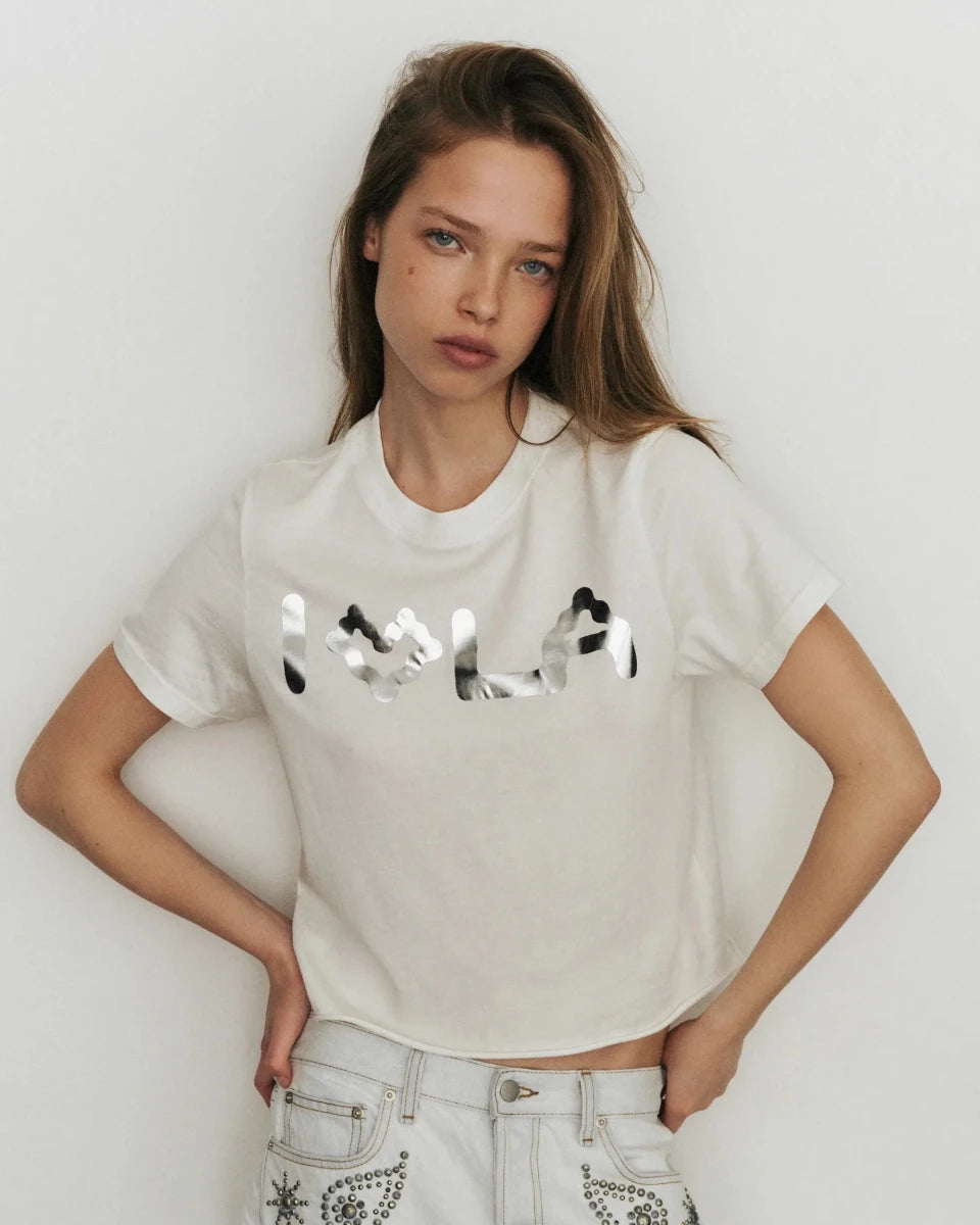 Finished with a raw-cut hem and a silver foil I Heart LA graphic.