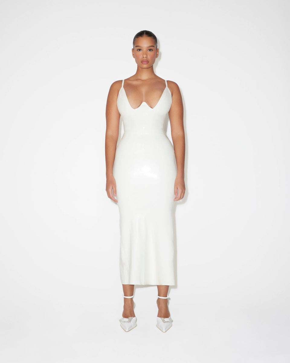 A maxi skirt featuring a zip closure at the back. Fabricated in ultra-high-gloss latex.  DO NOT WEAR IF YOU HAVE A LATEX ALLERGY.