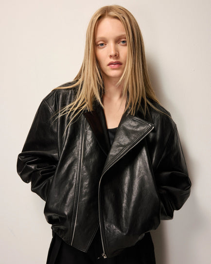 Crafted from subtly textured leather, this moto jacket features an offset front zipper for a modern edge. Wear it zipped up for a streamlined look or open for a relaxed feel. Tapered sleeves with exposed metallic zips can be unzipped to create a fuller cuff. From dresses to denim, this silhouette layers perfectly over any look.