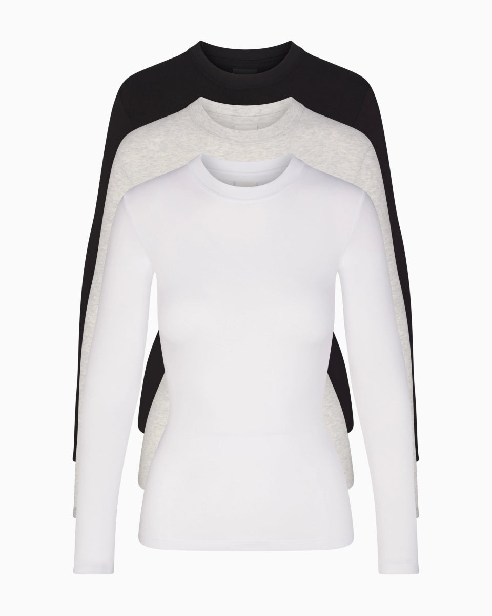 The perfect long sleeve, times three. Lightweight and relaxed, this tee is your go-to for effortless layering or easy off-duty looks. Stock up and wear on repeat. Comes in a set of three essential shades: White, Black, and Light Heather Grey.