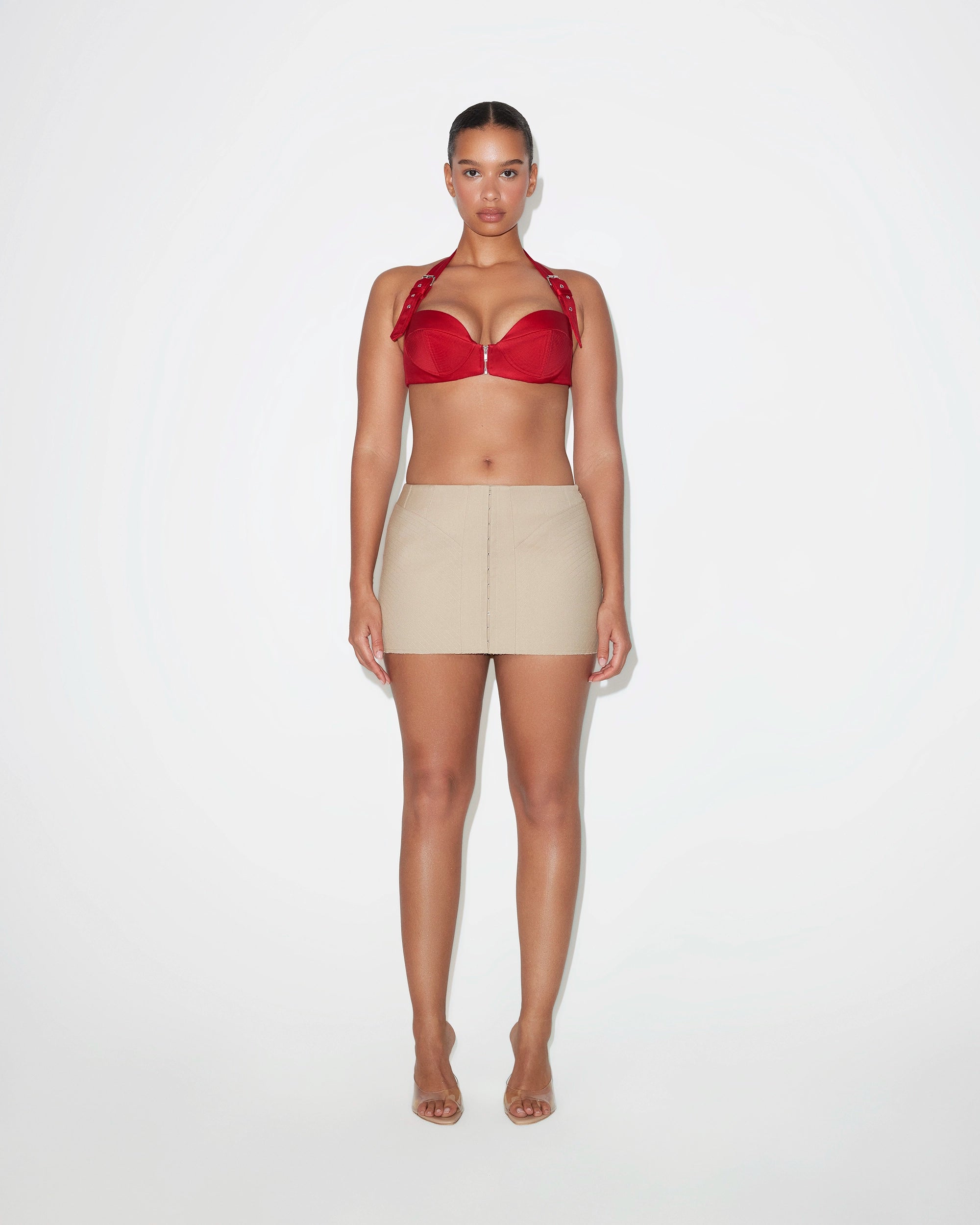 The Mini Corset Skirt is a low-rise, ultra micro-mini skirt. Features contoured stitching throughout the hips and a row of decorative hook-and-eye closures at the center front with a peek of ruffle detailing at the back hem. Invisible zip closure at the side seam. Pair with the Long Sleeve Corset Top for a fully coordinated look.