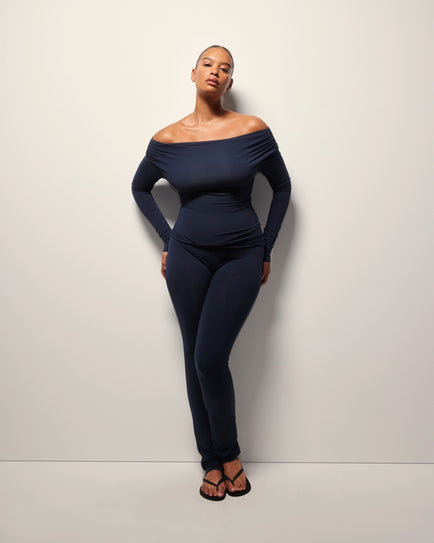 An off-the-shoulder long sleeve top with an adjustable neckline that can be styled off both shoulders or shifted to one for an asymmetrical feel, and light ruching at the sleeves for added dimension. Crafted from a luxe cotton blend for lasting comfort. Effortless, confident, and built to turn heads.