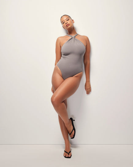 A halter bodysuit in a silky bamboo jersey with a touch of stretch that contours the body with a smooth, sculpted fit. Designed with a shirred halter neckline gathered by a signature pierced metal detail for a bold focal point. Finished with a snap button closure at the gusset and minimal back coverage for a seamless, barely-there finish under layers. Pairs effortlessly with bottoms from the collection for a coordinated look. Exclusively designed by Kylie Jenner and GRACE LING.