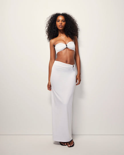 A statement maxi skirt designed to trace the body. Crafted in a silky bamboo jersey that hugs the waist and drapes effortlessly down the leg. Finished with a signature pierced metal detail at the front waist for a subtle yet striking asymmetrical profile. Exclusively designed by Kylie Jenner and GRACE LING.