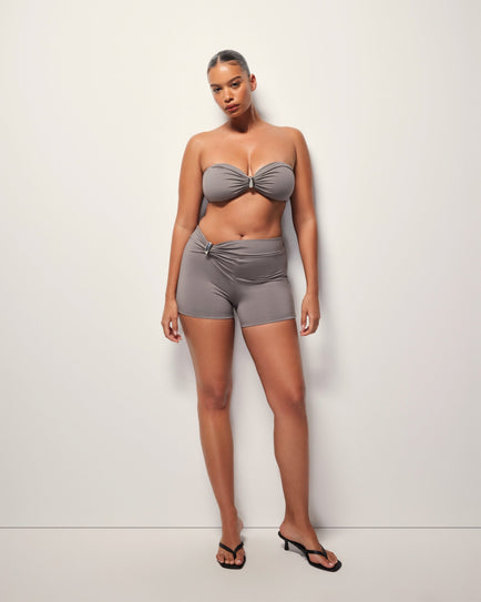 An adjustable low to mid-rise mini short crafted in a silky bamboo jersey with a touch of stretch. A signature pierced metal detail cinches the waist for a bold asymmetrical waistline, designed to style your way. Exclusively designed by Kylie Jenner and GRACE LING.