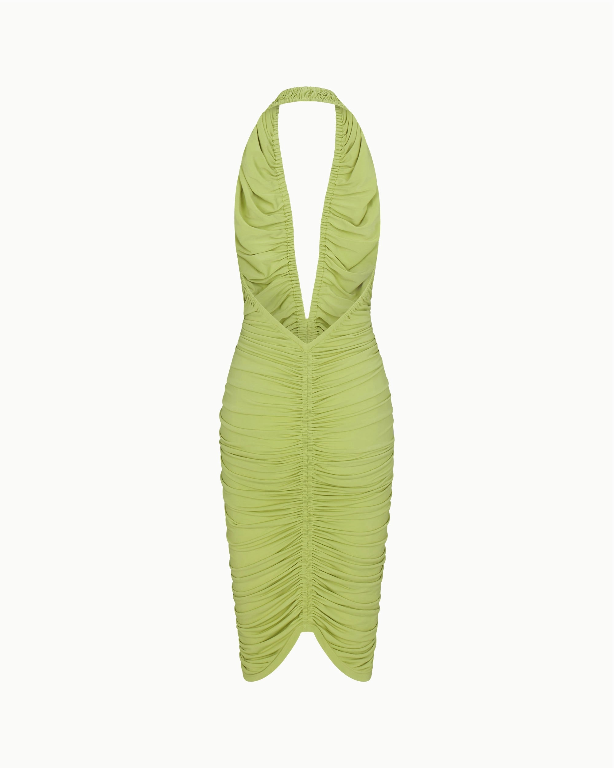 Designed in collaboration with Atlein, this midi-length dress features a deep V halter neckline. Made from a matte, stretch jersey with a draping effect.
