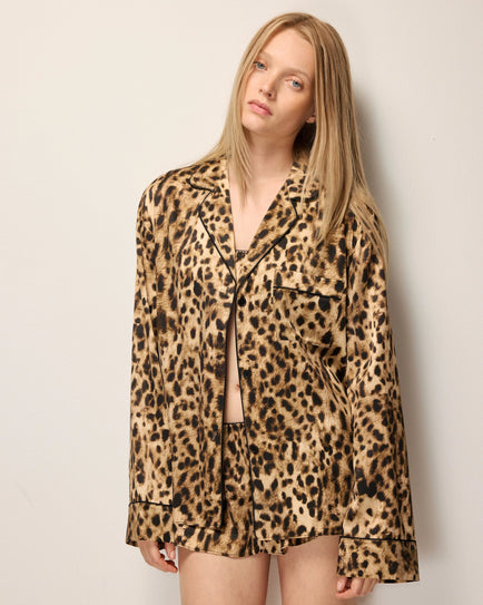 A luxurious silk button-down designed with a relaxed, true pajama fit. Features subtle tonal piping and a front breast pocket, and sizing that coordinates perfectly with the matching short. Lightweight, smooth, and timeless, it completes a polished set that can be worn day or night.