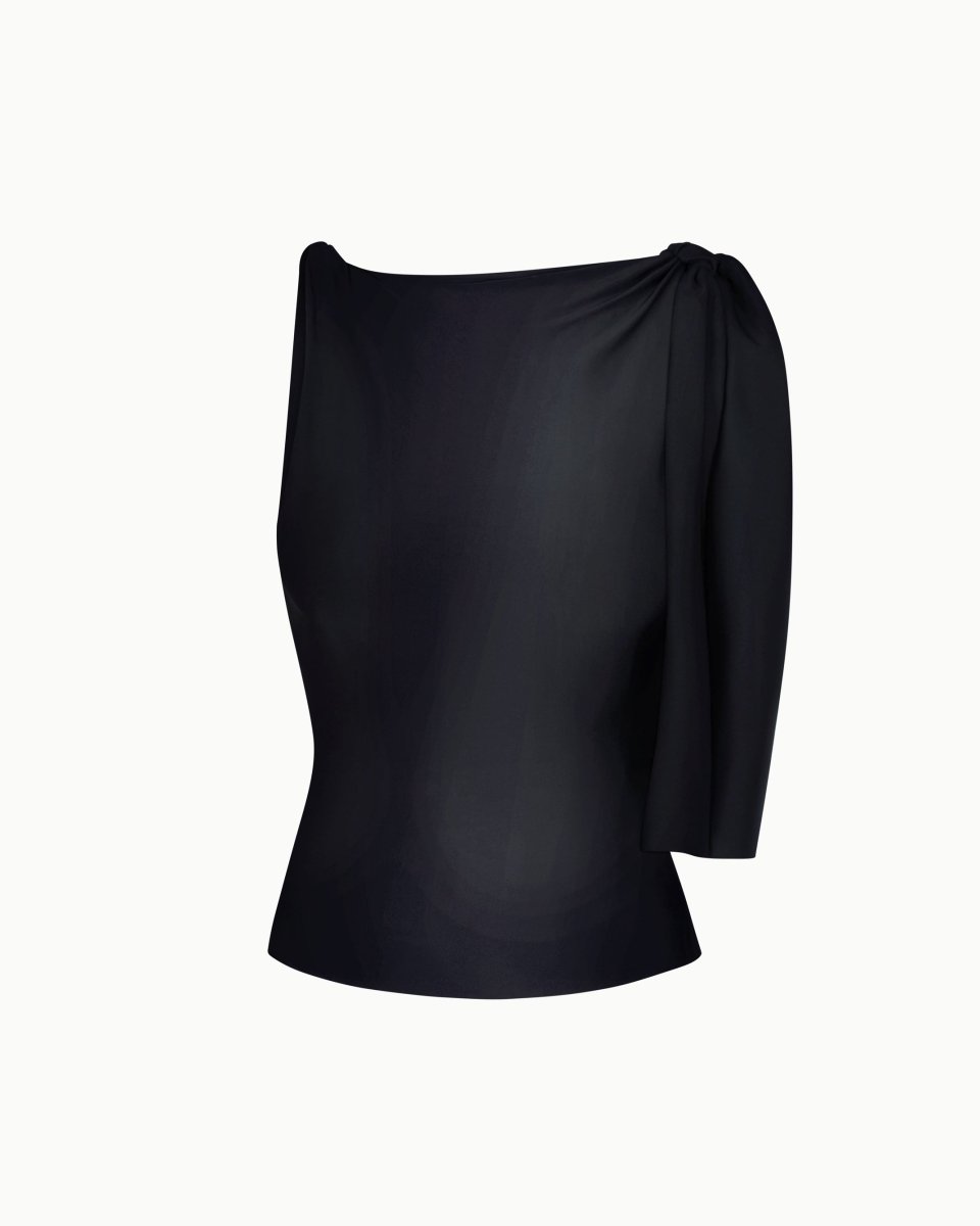 A fitted top with tie detail on one shoulder. made from sleek stretch an ultraflexible fabric with a silkysoft feel.