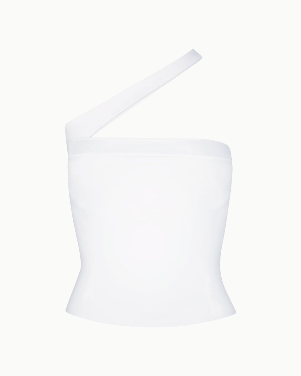 A fitted tube top with asymmetrical cutout band detail. made from sleek stretch an ultraflexible fabric with a silkysoft feel. this style in the bright white colorway is intended to be slightly sheer.