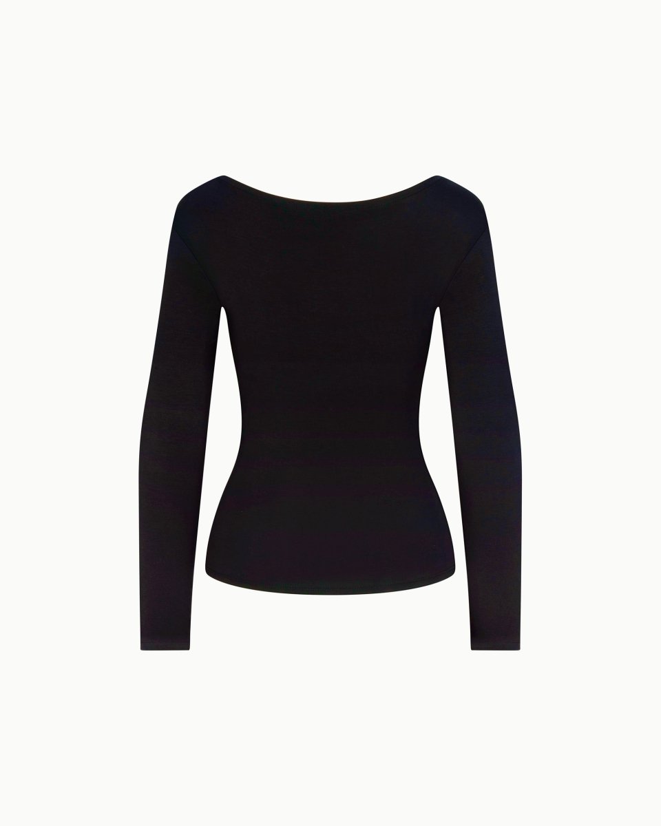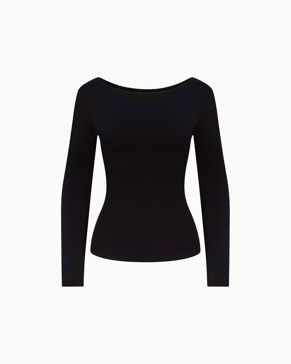 A boat neck long sleeve top made from a lightweight, stretchy modal jersey fabric.