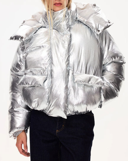 Designed with Entire Studios, this puffer brings a reflective, metallic edge to cold-weather dressing. Defined by a short, boxy frame, this silhouette layers easily while maintaining a contemporary feel. A removable hood offers versatility, and the plush alternative down fill keeps the structure voluminous and warm without weight.