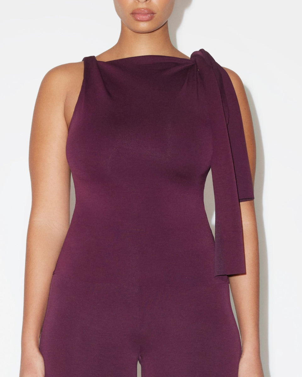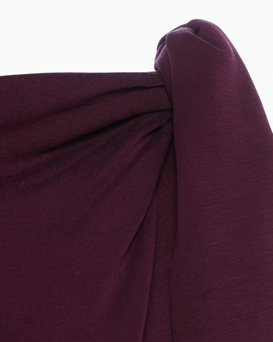 A fitted top with tie detail on one shoulder. Made from sueded stretch a buttery-soft, flexible fabric with a brushed, suede-like texture.