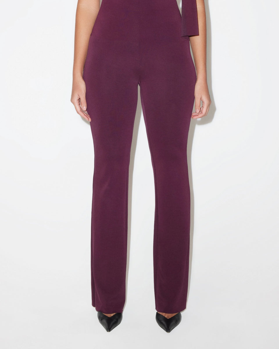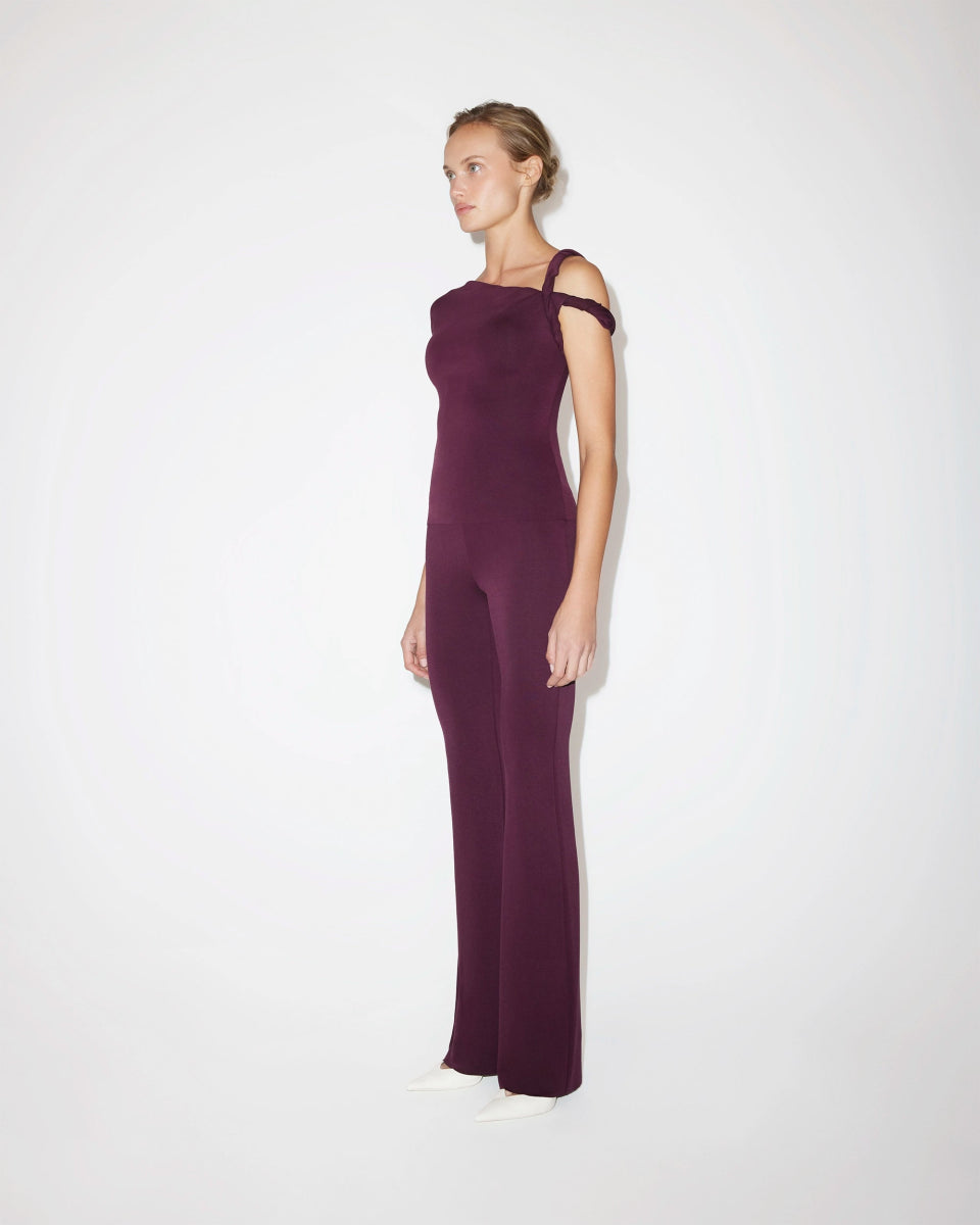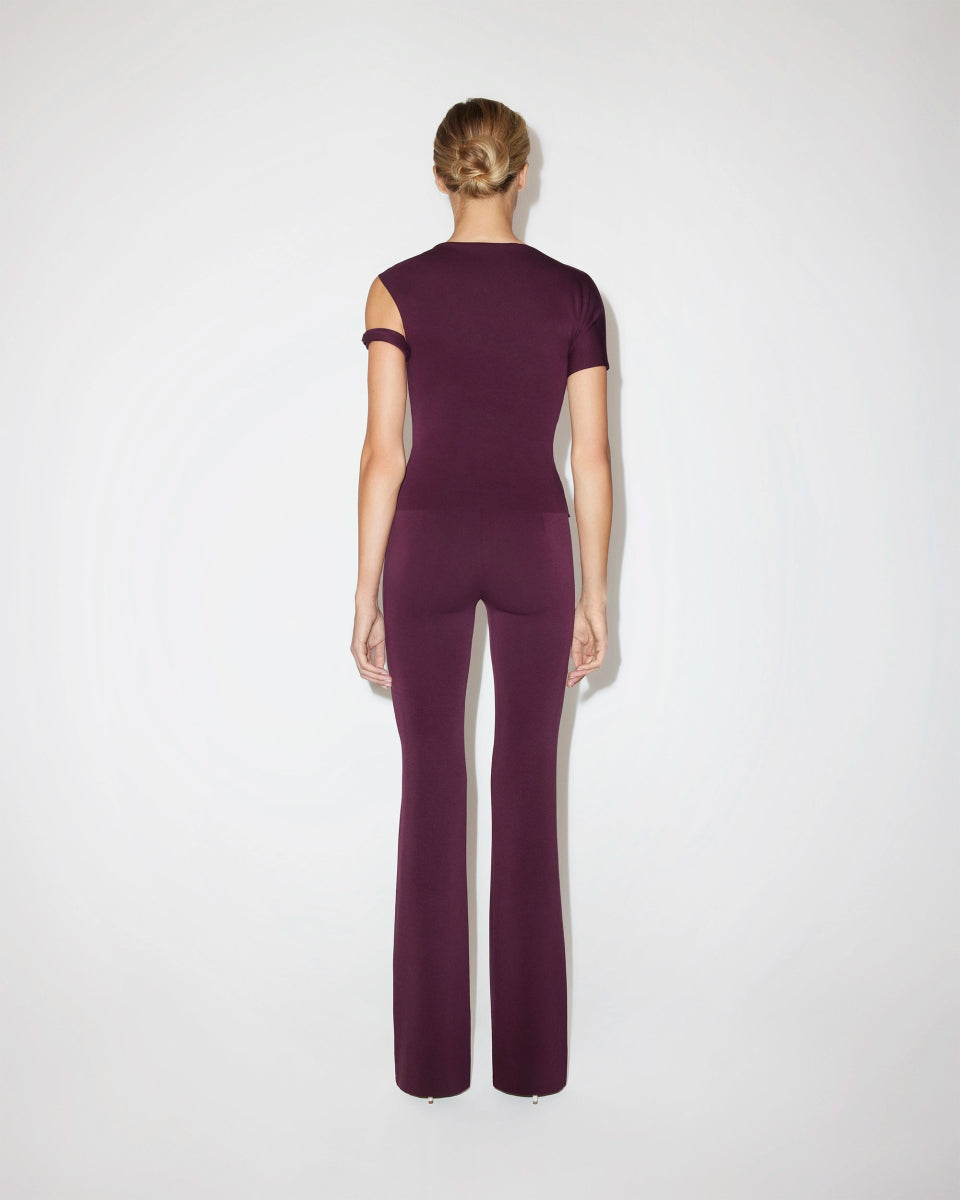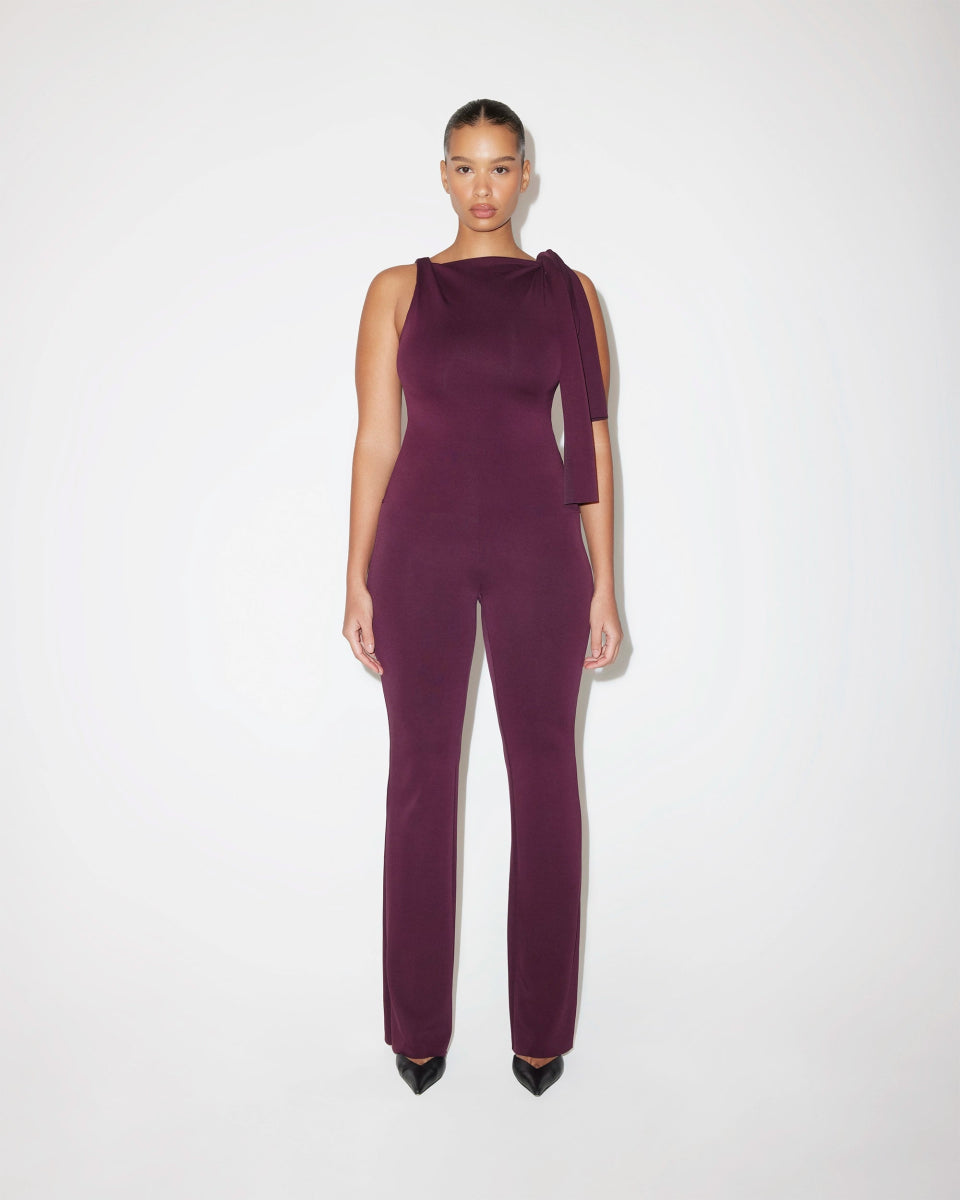 A fitted top with tie detail on one shoulder. Made from sueded stretch a buttery-soft, flexible fabric with a brushed, suede-like texture.
