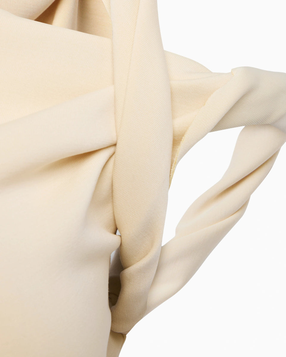 A fitted top with tie detail on one shoulder. Made from sueded stretch a buttery-soft, flexible fabric with a brushed, suede-like texture.