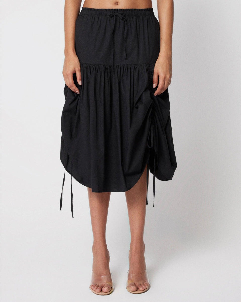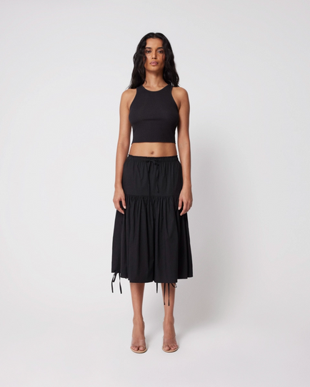 This is a tiered midi skirt with a drawstring waistband. Made from a lightweight, soft, clean-finish cotton with light stretch.