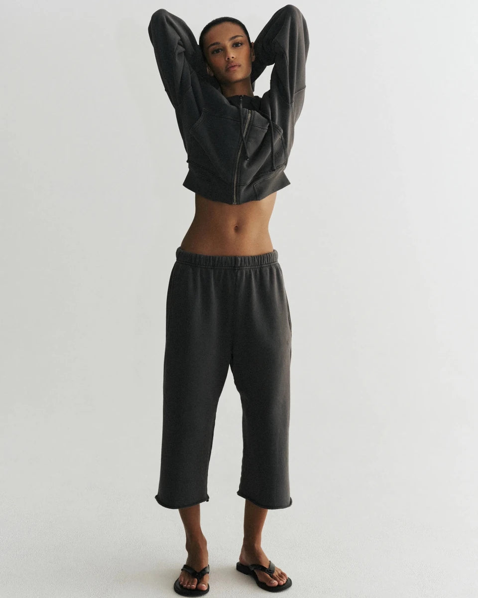 Straight silhouette with a ribbed drawstring waistband and darted pockets.